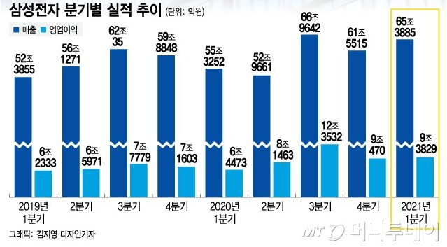 오늘 삼성전자 실적 발표가 있었다. 실적 발표에서 1분기 매출이 65조3885억원, 영업이익이 9조3829억원으로 집계됐다고 밝혔다. 지난해 1분기(매출 약 55조3252억원, 영업이익 6조4473억원)와 견주면 대비 매출은 18.2%, 영업이익은 45.5% 늘었다. 매출은 역대 최저치였던 지난해 3분기(66조9600억원)에 맞먹는다. 1분기 기준으로는 역대 최대다. 최근 제기된 외형 성장 둔화 우려를 불식시켰다는 점에서 시장에서도 호평이 이어진다.