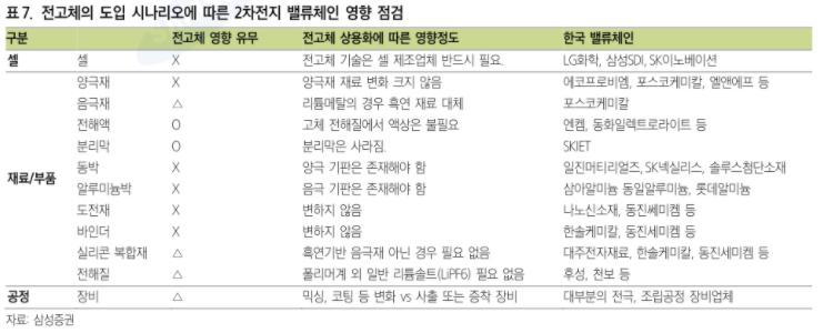 리튬이온 배터리 관련 기업체의 전고체의 도입된다면 밸류체인 영향을 점검해 볼 수 있는 표이다.