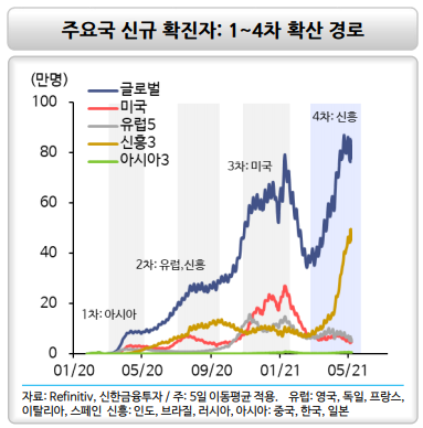 - 인도를 중심으로 신흥국이 주도한 4차 확산 우려에 봉착. 글로벌 일간 신규 확진자 80만명 상회하며 역대 최대치 경신. 이 중 70% 이상이 신흥국 발 감염. 선진국 향 백신 보급 확대에도 감염 확산, 변이 바이러스 공포 극대화