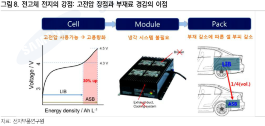 1) 에너지밀도 개선 - 전고체 전지는 고체 전해질 적용으로 인해 단전지(기본 단위 셀) 내에서 고전합 작동이 가능하다. 그리고 분리막이 없어지고, 액상의 전해액이 사라지면서 셀을 구성하는 부재료의 감소도 나타난다. 셀 단위에서 고전압이 가능하고 부피가 줄다 보니 부피당 에너지 밀도는 전고체 전지의 두드러진 장점이다. 이는 패키징으로 갈수록 부자재를 더 줄일 수 있기 때문에 완성차 업체들이 주목할 수밖에 없을 것이다.