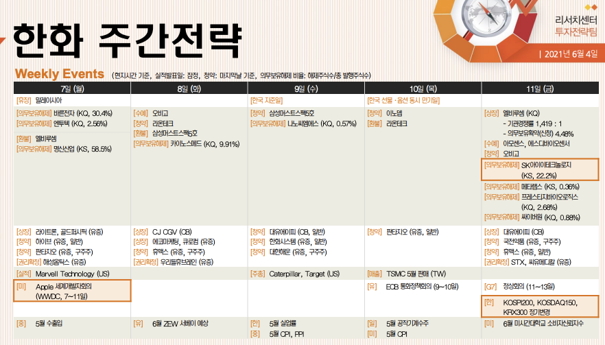 6월 선물옵션만기일을 맞아 종가에 KOSPI200, KOSDAQ150, KRX300 등의 지수 정기변경이 이루어질 예정. KOSPI200에는 대한전선, 동원산업, 효성티앤씨, 효성첨단소재, SK바이오사이언스, SK아이테크놀로지 6종목이 편입될 예정. KOSPI200의 경우 한국 ETF들이 벤치마크로 가장 많이 사용하는 지 수라는 점에서 편입을 앞두고 매수세가 유입될 수 있지만, 실제 변경 이후에는 수급 모멘텀 둔화 전망.