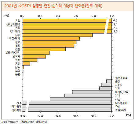 ▶ 상향 업종: 유틸, 상사/자본재, 정유, 헬스케어 vs. 하향 업종: 호텔/레저, 조선, 디스플레이, IT H/W