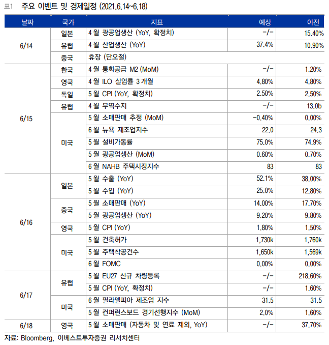 6월 FOMC가 15~16일로 예정되어 있으며, 한국 시간으로 17일(목) 새벽에 결과를 확인 할 수 있을 예정. Fed Watch에서 제시하는 수치에 따르면, 현재 시장금리는 이번 FOMC에서 기준금리가 동결 될 확률을 97%, 25bp 인상될 확률을 3%로 반영하고 있는 상태. 이 수치는 1개월전(5/7 기준)에 25bp 인상 확 률 10%에 비해 완화된 수치. 이번 FOMC에서 수정경제전망치가 발표될 예정. 지난 3월 FOMC에서 올해 경제 성장률 전망치를 4.2%에서 6.5%로 대폭 상향조정 했다는 점에서 추가적으로 상향조정 할지 여부도 주목할만 한 부분. 만약 성장 전망치가 재차 높게 상향조정될 경우 이는 경기회복에 대한 연준의 자신감 또는 확신으로 해석될 수 있어 8월 잭슨홀 미팅에서의 테이퍼링 언급 가능성 배제할 수 없다는 판단. 최근 거래가 급증한 RRP 시장에 대한 연준의 입장 또는 조치 여부도 중요하게 봐야할 포인트.