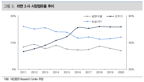 - 2010년 이전 10%에 불과, 오뚜기의 라면 시장 점유율이 2018년 24%까지 확대, 경쟁 강도 심화