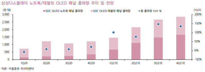 삼성디스플레이의 OLED 노트북 및 태블릿 패널 출하량은 총 914만 대 (+115%YoY)를 기록할 것으로 전망.