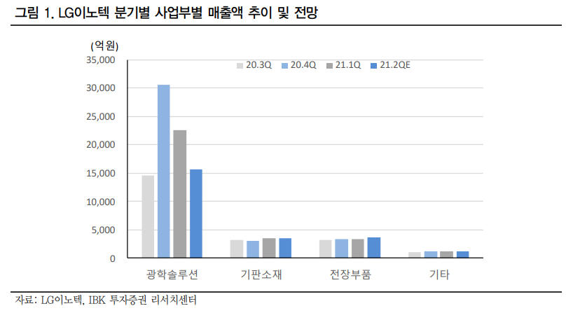 - LG이노텍의 2021년 2분기 매출액은 1분기 대비 22.5% 감소한 2조 3,785억원으로 예상.