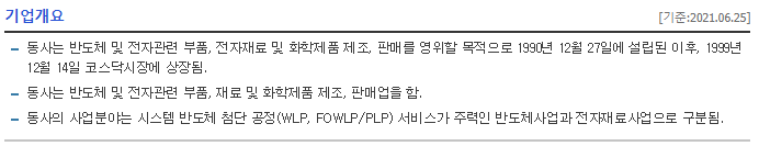 - 자회사를 통해 반도체 후공정 테스트, 팬아웃 패키징, 2차전지용 리드탭 사업 영위.