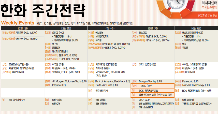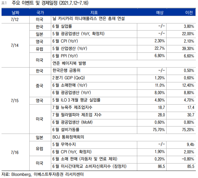 | 다음주 금융시장 주요 이벤트(2021.7.12~7.16) |