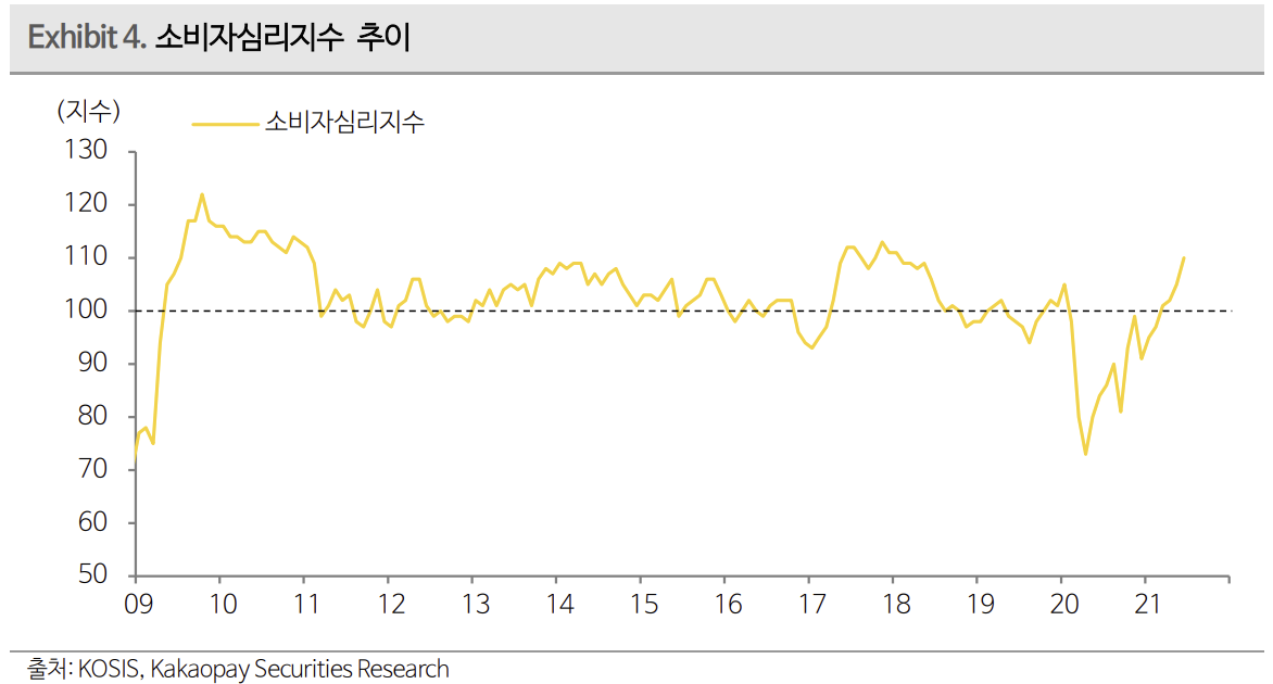 - 백신 이후의 삶에 대한 기대감 상승, 소비자심리지수 21년 3월 13개월만에 100 이상 기록 후 지속적으로 상승.