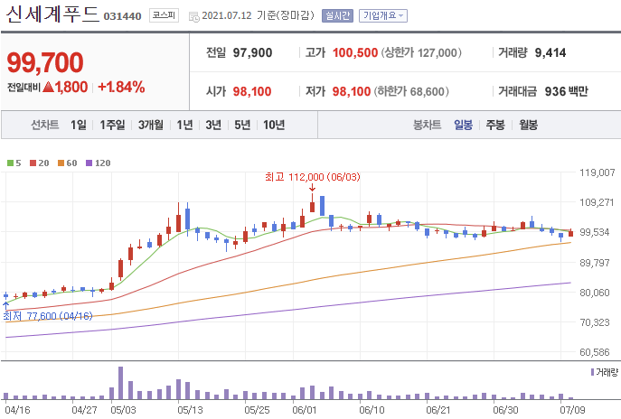 - 전주 하락: 롯데푸드 -8.3%(차익 실현 매물 출하), 하이트진로 -6.1%(델타 변이 바이러스 확대 우려), SPC삼립 -5.7%(델타 변이 바이러스 확대 우려), 현대그린푸드 -4.3%(델타 변이 바이러스 확대 우려), 롯데칠성 -4.2%(델타 변이 바이러스 확대 우려), 빙그레 -3.6%(비우호적인 날씨 지속), 농심 - 3.5%(2분기 실적 부진 전망), 대상 -3.3%(2분기 실적 시장 기대 소폭 하회 전망) 등.