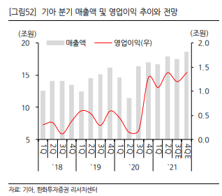 - 기아의 2Q21 실적은 매출액 18.4조원(YoY +61.6%), 영업이익 1.45조원(YoY +899%) 을 기록할 것으로 예상.