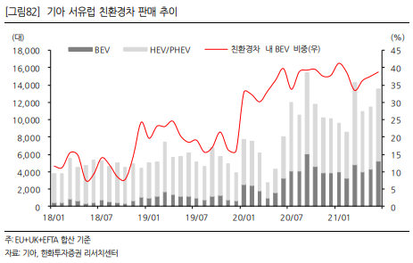 2H21 신차 효과 확대 지속이 예상된다. ①글로벌 판매 내 신차 판매 비중 상승에 따른 ASP 상승, ②K8 출시 효과(내수 ASP 상승), ③글로 벌 볼륨 차종인 스포티지와 E-GMP 기반 BEV EV6 출시 등 때문이다. 특히 EV6 출시 이후 전기차 판매 증가 본격화를 통한 BEV M/S 상승 확인 시 주가 상승의 촉매제 역할을 할 것으로 기대된다.