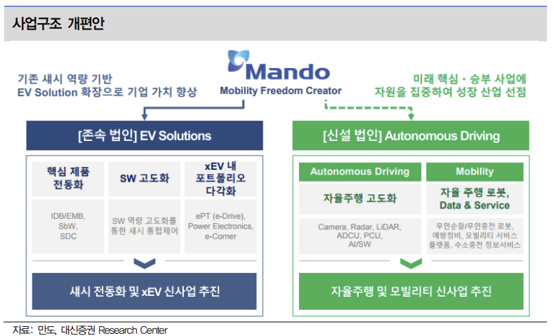 - 신설 법인 ‘만도 모빌리티 솔루션(MMS)’은 자동차 부품을 비롯해 자율주행로봇, 모빌리티 서비스 등을 중심으로 하는 자율주행 전문기업으로 발돋움 예상.