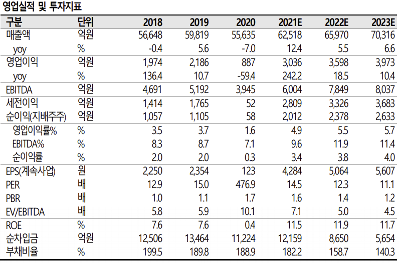 - 2Q21 실적, 매출액 1조 4,875억원(+46.8%, 이하 YoY), 영업이익 728억원(흑전), 지배주주순이익 434억원(흑전) 기록.