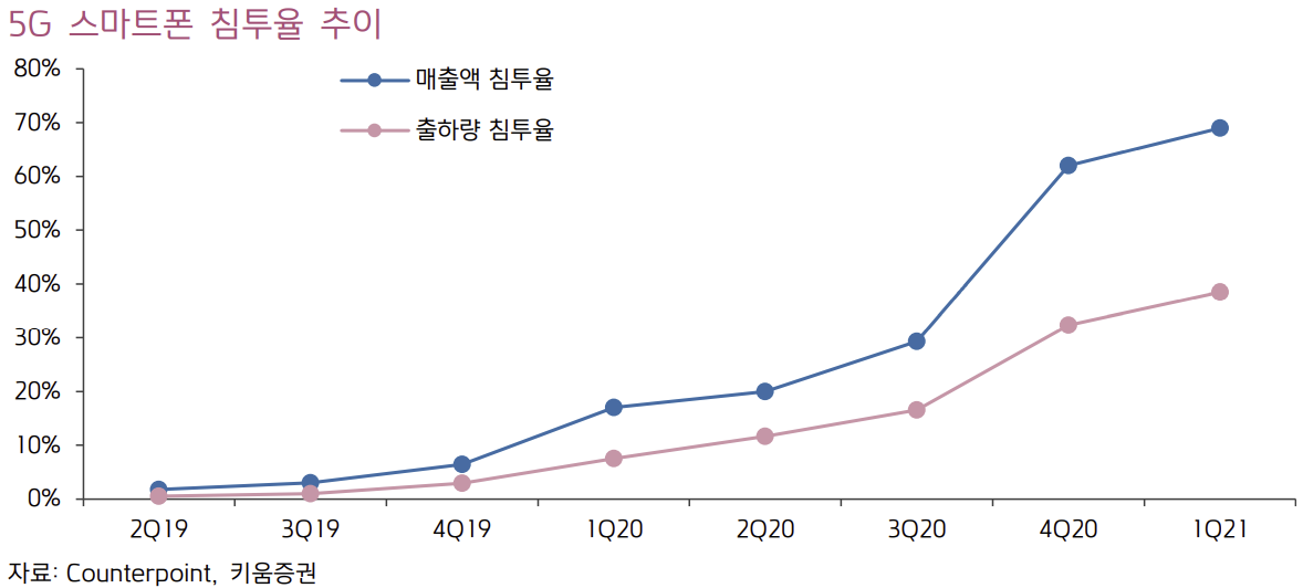 - 코로나 재확산과 함께 스마트폰 수요 전망치가 하향되는 과정에서도 5G폰 전망치는 상향되고 있는 점 주목.