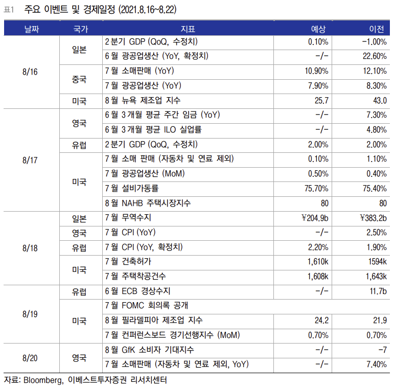 7월 말에 있었던 FOMC 회의의 의사록 공개 예정. 7월 FOMC 이후 파월 의장이 이번 회의에서 처음으로 테이퍼링의 시점, 속도, 구성에 대한 심층 분석을 진행했다고 언급했던 만큼, 테이퍼링 시점에 대한 연준 위원들의 의견과 분위기를 확인할 수 있을 것이라는 점에서 관심이 필요. 8월말에 예정된 잭슨홀 미팅에서 테이퍼링 일정에 대한 중요한 언급일 있을 것이라는 기대가 커지는 가운데, 대표적인 매파인 로버트 카플란 델러스 연은 총재가 9월에 테이퍼링을 발표하고 10월에 시작해야한다는 입장을 내놓은 상황.