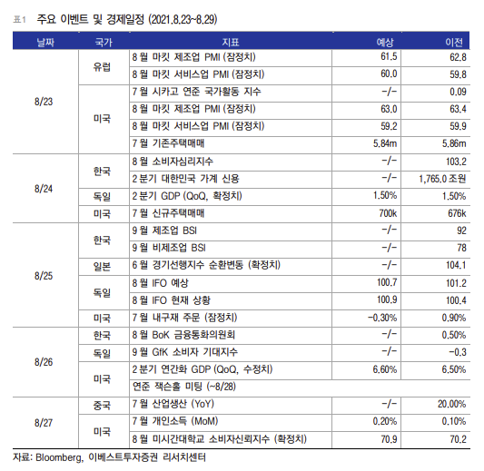 이번 주 국내 증시는 미국의 잭슨홀 미팅을 앞두고 투자자들의 관망세가 이어지는 가운데, 테이퍼링(자산매입축소) 불확실성 해소 여부에 따라 단기 급락에 따른 반등 시도가 나타날 것으로 전망된다.