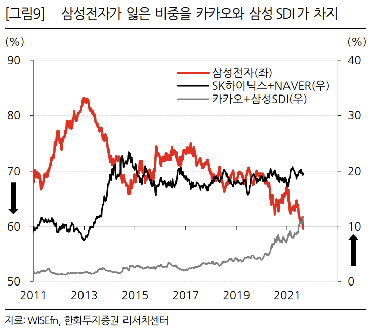 한 때 80%를 넘어서고 평소 70% 내외였던 삼성전자 비중은 지난주 60%를 깨고 내려와 사상 최저 수준에 위치, 사라진 삼성전자의 10%p는 카카오와 삼성SDI가 대부분 가져왔다. 60%가 무너짐과 동시에 카카오와 삼성SDI의 합산 비중은 처음으로 10%를 돌파했다. 한국의 신성장동력으로 삼았던 BBIG(배터리/바이오/인터넷/게임) 중 B(배터리), I(인터넷)를 외국인이 주목하고 있다[그림9].