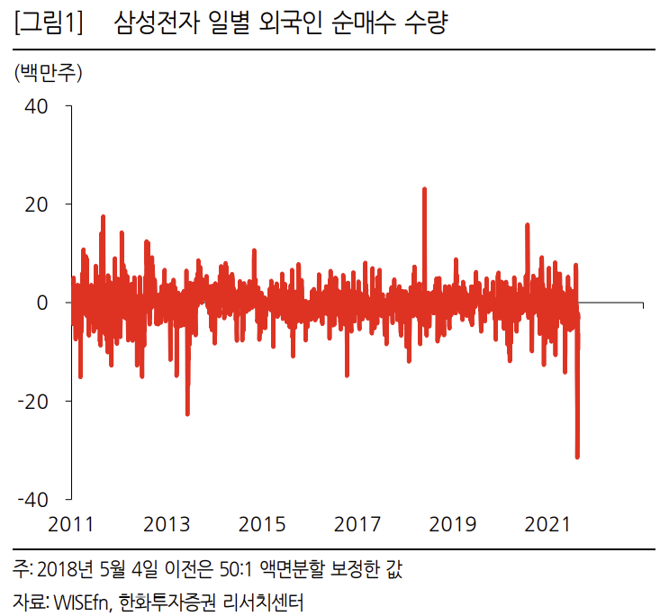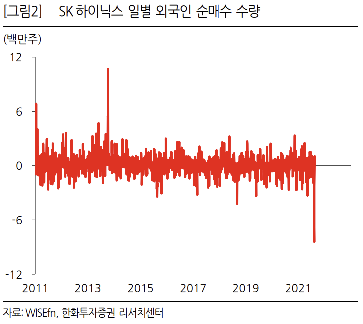 외국인 매도가 어떤 주식에 집중됐는지는 어렵지 않게 찾을 수 있다. 우리나라 시가총액 1, 2위인 삼성전자와 SK하이닉스는 같은 기간 각각 7.1조원, 1.8조원 가량의 외국인 순매도를 기록했다. 지난 10년 동안 외국인이 매일 매일 두 주식을 얼마나 사고 팔았는지를 살펴보면 최근의 매도는 육안으로 확인 가능할 정도로 이례적이고 강한 매도였다[그림1,2].