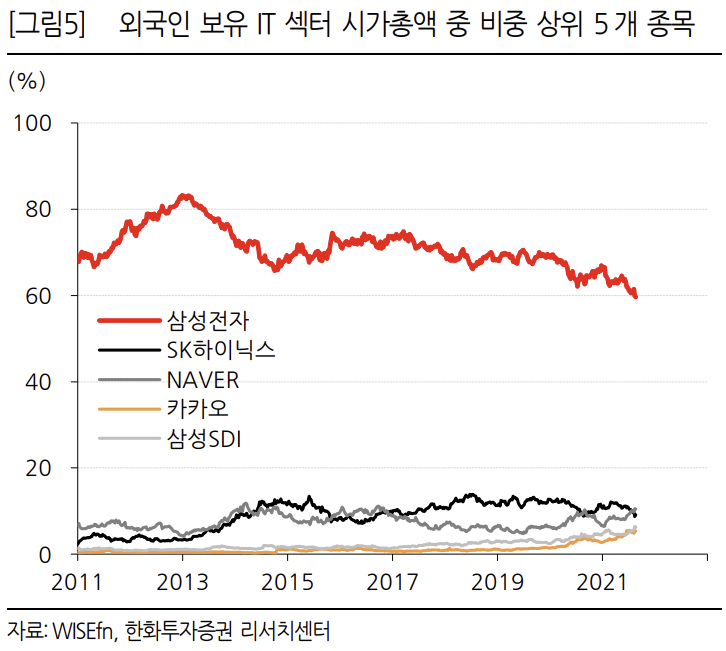 외국인이 갖고 있는 IT 전체 시가총액 중 삼성전자 시가총액은 2010년대 한 때 80%를 웃돌았다가 70% 내외로 안정되고 있었다. 외국인을 하나의 주체로 본다면, 외국인의 한국 IT 포트폴리오 중 70%가 삼성전자였다는 의미다[그림5].