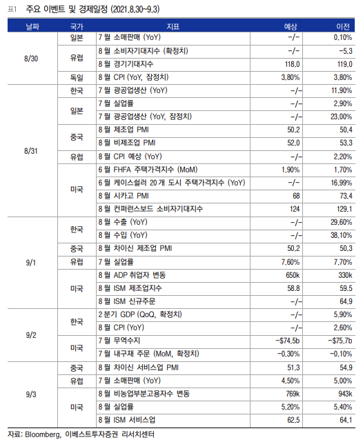 ISM 제조업지수, 고용 지표 등 주요 경제지표가 주 후반에 발표될 예정. 잭 슨홀 미팅이 종료되고 9월말에 FOMC를 앞두고 있는만큼, 테이퍼링 스케쥴을 가늠할 수 있다는 점에서 이번 고용지표 발표는 특히 중요할 예정. 현재 ISM 제조업지수는 지난 달 59.5에서 59.0로, ISM 서비스업 지수는 64.1에서 62.5로 둔화될 것으로 추정치가 형성되어 있는 상태. 비농업고용자수의 경우 지난 달 94.3만명에 비해 감소한 80.0만명으로 감소하겠지만, 실업률도 지난 달 5.4%에서 5.2%로 개선될 것으로 컨센서스가 형성. 연준 은 통화정책 변경을 위해서는 고용 지표 개선을 확인해야 한다는 입장을 유지해왔던만큼, 9월 1일에 발표 예정 인 ADP 취업자 변동과 3일에 발표 예정인 고용지표 발표가 특히 중요할 것.
