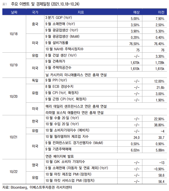 인플레이션과 3·4분기 실적 피크아웃(고점 통과) 우려 등이 지수 상승을 제한하겠단 것이다. 11월부 국내에서도 '위드 코로나'가 진행된단 점 등은 긍정적인 기대 요인으로 분석됐다.