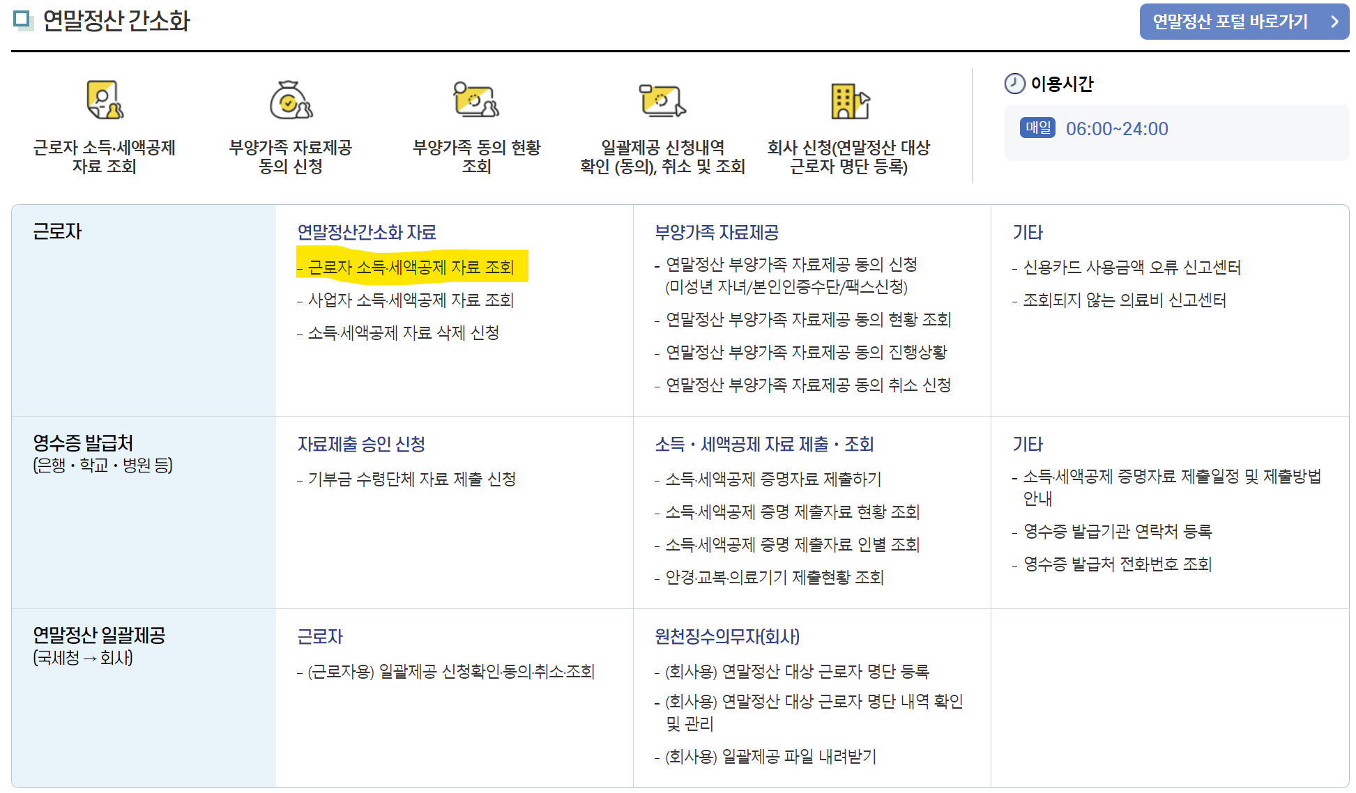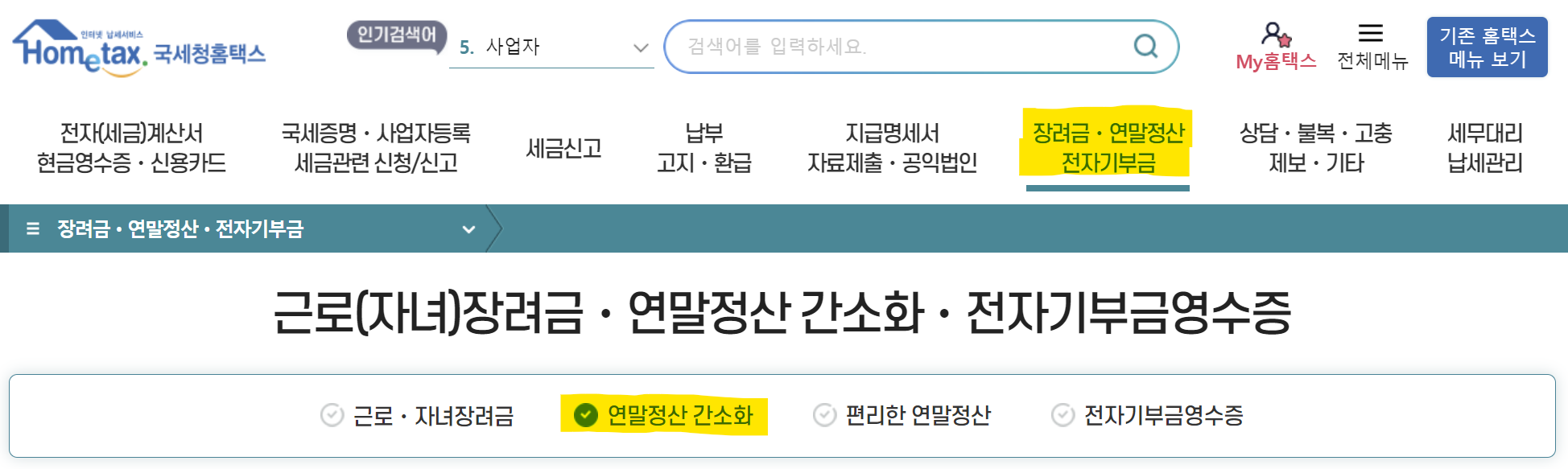 "연말정산 간소화"를 선태하면 연말정산 간소화 관련 내용으로 화면이 이동됩니다.