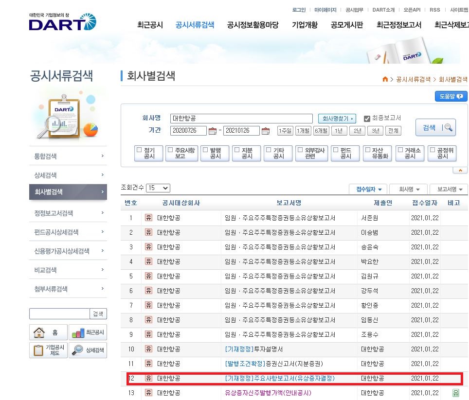 회사명을 입력하고 조회하면 아래와 같이 출력된다. 유상증자에 관련한 내용을 보기 위해
