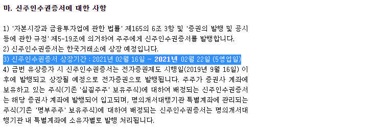"신주인수권증서 상장기간 : 2021년 2월 16일 ~ 2021년 2월 22일 (5영업일)"