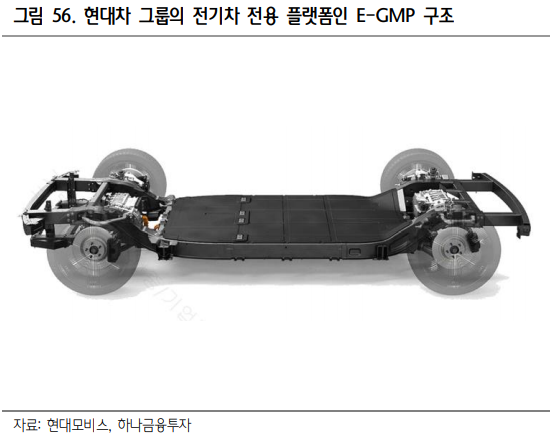 현대의 전기차 핵심이 E-GMP(ElectricGlobal Modular Platform)라는 전기차 전용 플랫폼이다. 특히, 2021년부터는 E-GMP 기 반의 전기차 모델들이 다수 출시되는데, 현대차는 아이오닉5부터 아이오닉6, 아이오닉7, 아 이오닉3, 제네시스 JW 등이 투입되고, 기아차는 CV(프로젝트명)부터 라인업 구축을 시작한다. 전용 플랫폼 적용을 통해 가격 대비 효율성 측면에서 추가적인 개선이 가능하기 때문에 현대차/기아차의 전기차 사업에 있어 또 한번 도약의 계기로 작용할 것이다.