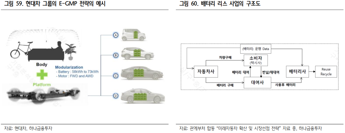 ④ 배터리 탈부착도 검토된다. E-GMP 플랫폼은 배터리 탈부착이 가능해 교체가 용이한 것 으로 알려졌다. 이는 최근에 현대차가 배터리업체들과 논의 중인 배터리 리스/렌탈 사업 과 연계될 수 있을 것이다.