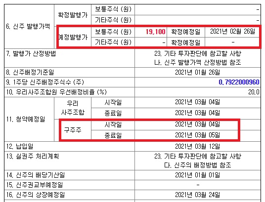 예정 발행가를 19,100원으로 변경했고, 확정예정일은 2021년 2월 26일이다.