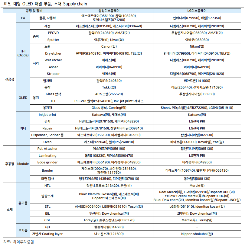 스마트폰 OLED 시장에 적신호가 들어왔지만, 2월 22일 하이투자증권에서 작성한 OLED 관련 리포트로 OLED BIG Cycle로 하반기 주가 상승을 예상하고 있다. 아래, 국내 장비 소재/부품 기업으로 눈여겨보자.