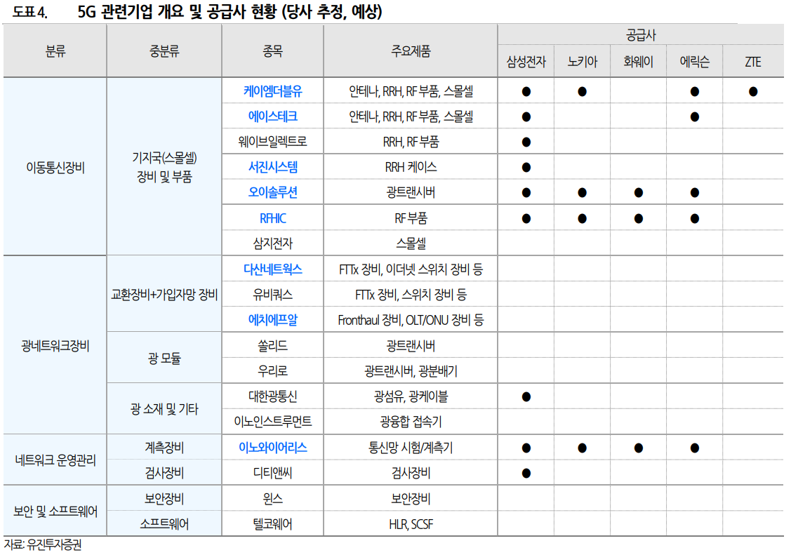 - RFHIC : 기지국 부품소재 제조업체. 삼성전자, 노키아, 화웨이 등에 공급 예상
