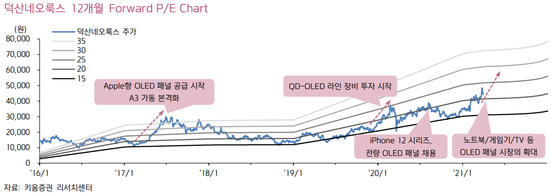 ‘21년 OLED 노트북, 차량용 디스플레이, 폴더블 스마트폰 등 어플리케이션 다변화에 의한 실적 성장과 ‘22년 고객사 라인 증설(QD-OLED 30K, 중소형 OLED 30K), Apple의 OLED iPad 출시로 지속적인 실적 성장이 예상된다. 글로벌 OLED소재 업체는 10개 내외로 기술 진입 장벽이 높아 생존한 소재 업체의 실적 성장과 멀티플 리레이팅이 예상된다.