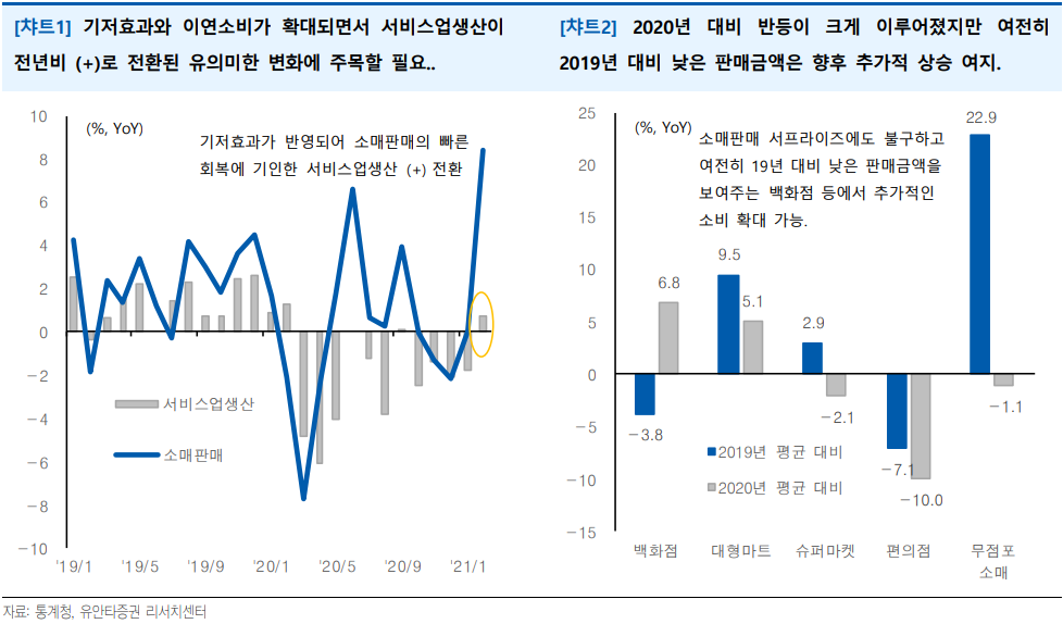 ○ 서비스업 생산은 1년 만에 전년비 기준으로 (+) 전환. 2월 소매판매는 전년비 +8.4% 증가로 긍정적 수치. 특히 백화점 매출이 크게 증가한 모습이 확인.