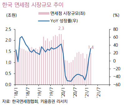 - 해외 여행 재개 전반부까지는 면세점 업체들의 회계적 영업이익도 개선되고, 실제 펀더멘털도 개선된다는 것
