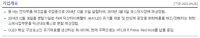 향후 ① 삼성디스플레이의 OLED 제품군 확대, ② 4Q21 QD-OLED TV 패널 양산 본격화, ③ 중국 패널 업체들의 중소형 OLED 라인 가동률 상승은 동사의 큰 성장 동력이 될 전망이다. 올해 삼성디스플레이는 13.3”~16”까지 총 10 종 이상의 노트북용 OLED 패널을 생산할 예정이다. 또한 내년부터는 삼성전자뿐만 아니라 애플도 iPad 에 OLED 패널을 채택할 계획이기 때문에 스마트폰 시장을 넘어 OLED 패널 적용처 다변화를 통한 출하면적 확대가 예상된다. 특히 최근 언론에 따르면 삼성디스플레이는 2022년 삼성전자, Sony 등으로 QDOLED TV 패널 공급을 위해 4Q21 부터 Q1(30K/월) 라인 양산 가동을 시작할 계획인 것으로 알려졌다. 주력 고객사의 OLED TV 시장 확대는 동사의 HTL 수요 증가에 미치는 영향이 상당히 클 것으로 전망된다. 휘도, 수명 향상을 위해 적용되는 3 Tandem 적층 구조의 OLED TV 패널 대당 소재 사용량은 스마트폰용 OLED 대비 두께는 약 3 배 이상, 면적은 약 100 배(55”, 65” 크기 평균 기준) 수준으로 총 300 배 가량 증가하기 때문이다. 내년에 OLED TV 패널 연간 100 만대만 생산한다고 가정하더라도 스마트폰용 OLED 로 환산시 약 3 억대에 달하는 소재 수요가 발생할 수 있다. 현재 삼성디스플레이의 연간 모바일용 OLED 패널 출하량이 약 4 억대 수준이라는 점을 감안할 때 OLED 소재 시장의 판이 달라질 수 있다는 의미이다. 이를 반영한 2021 년 매출액과 영업이익은 각각 1,806 억원(YoY: +25%), 533 억원(YoY: +33%)을 기록할 것으로 추정된다.