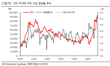 2H21 신차 효과 확대 지속이 예상된다. ①글로벌 판매 내 신차 판매 비중 상승에 따른 ASP 상승, ②K8 출시 효과(내수 ASP 상승), ③글로 벌 볼륨 차종인 스포티지와 E-GMP 기반 BEV EV6 출시 등 때문이다. 특히 EV6 출시 이후 전기차 판매 증가 본격화를 통한 BEV M/S 상승 확인 시 주가 상승의 촉매제 역할을 할 것으로 기대된다.
