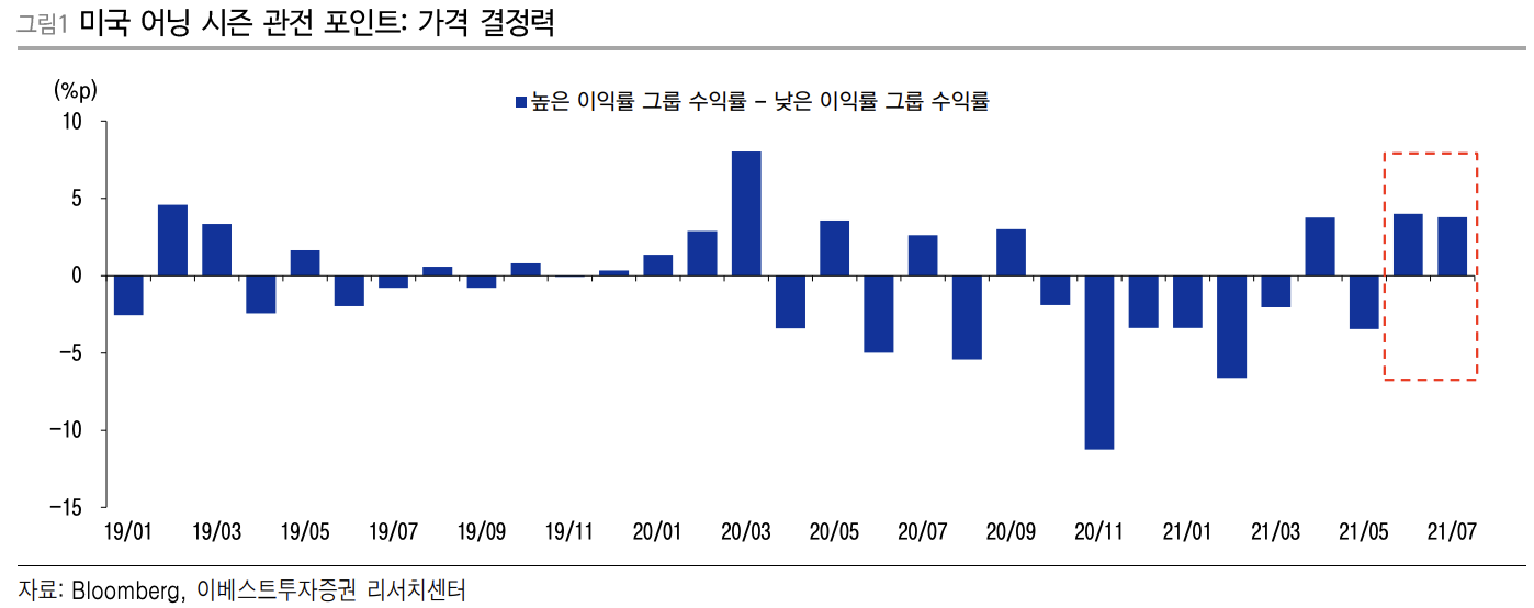 - 이는 기업들의 가격 결정력이 높은 기업이 비용 압박을 견뎌낼 수 있을 것이라는 평가가 반영된 결과이며, 이익률과 가격 결정력은 이번 어닝 시즌의 주요 관전 포인트가 될 것.