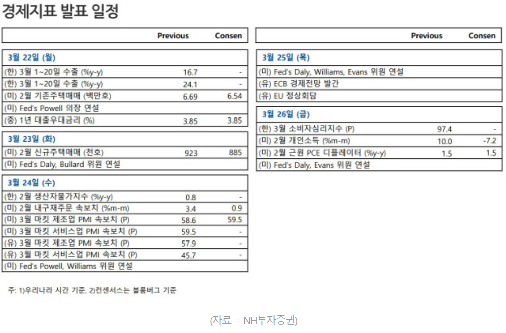 24일에는 2월 내구재수주와 정보제공업체 IHS마킷의 3월 제조업 및 서비스업 구매관리자지수(PMI)가 발표된다. 파월 의장이 상원에서 증언한다. 윌리엄스 뉴욕 연은 총재와 메리 데일리 샌프란시스코 연은 총재도 강연한다.