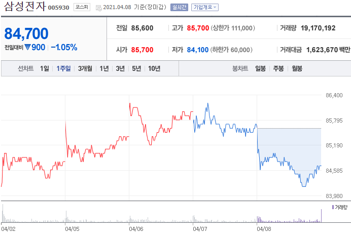 삼성전자의 호실적에도 불구하고 주가는 전일 대비 -0.47%로 마감