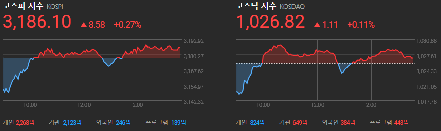 이날 코스피지수는 전 거래일 대비 8.58포인트(0.27%) 오른 3186.10으로, 코스닥지수는 전 거래일 대비 1.11포인트(0.11%) 오른 1026.82로 마감했다.