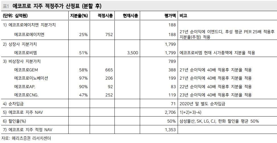 에코프로는 4월 29일 거래정지를 거쳐 5월 28일 에코프로(지주)와 에코프로에 이치엔(환경사업부문)으로 분할 재상장 예정. 당사는 에코프로에이치엔의 적정 가치를 7,500억원, 에코프로 지주의 적정가치를 1.35조원(NAV 50% 할인)으로 평가(표1). 합산 가치 2.1조원으로 평가되나 현재 시가총액은 1.3조원에 머 물러 있음. 4월 29일~5월 28일 거래정지 기간 동안의 기회비용을 넘어서는 업 사이드가 존재한다고 판단. 오히려 4월 22~23일 기후 정상 회의 이후 온실가스 감축 목표치 상향 여부에 따라 에코프로에이치엔의 적정가치 상향 조정을 염두에 둬야 함.