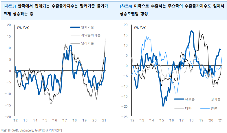 ▶ 수출기업들은 원자재가격이나 환율변동에 대응을 위하여 수출가격 수준을 조정하는 방법을 주로 사용. 결국 채산성을 개선시키기 위해서 수출제품의 가격이 높아지는 수순이 이어지는 것.